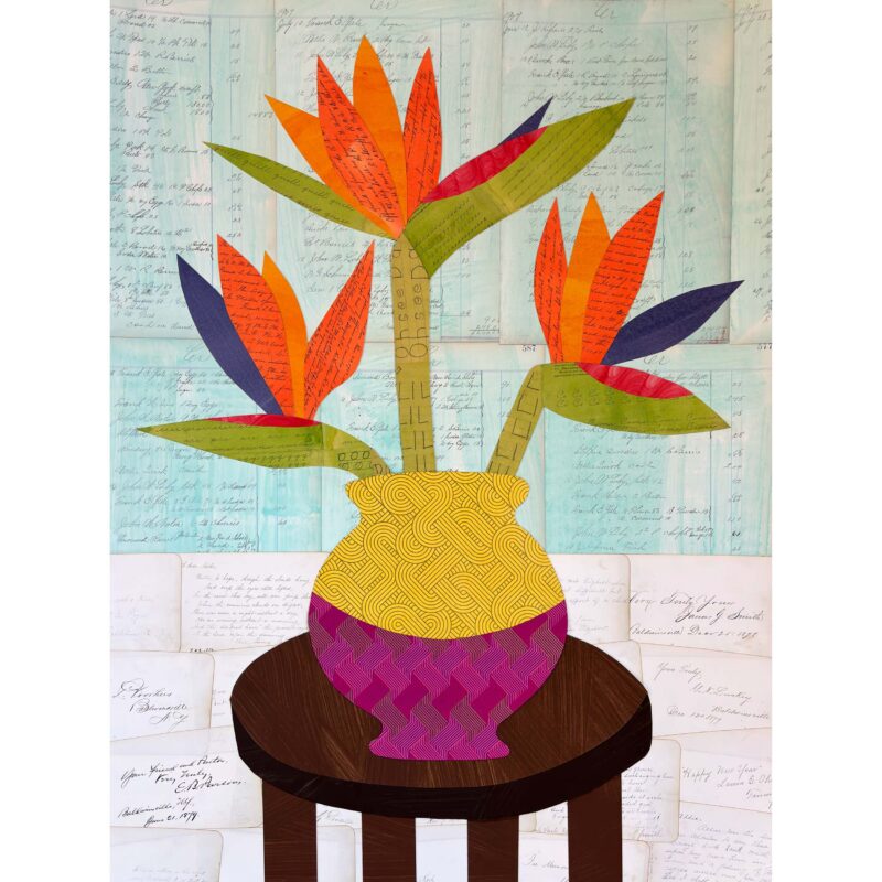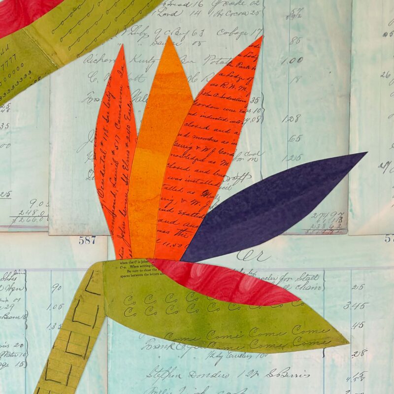 I create vibrant collages from antique papers. Using ephemera from the 19th and 20th centuries, I paint each piece with ink, then cut and assemble it into new stories. My aim is to make artwork that brings joy and invites a sense of wonder.