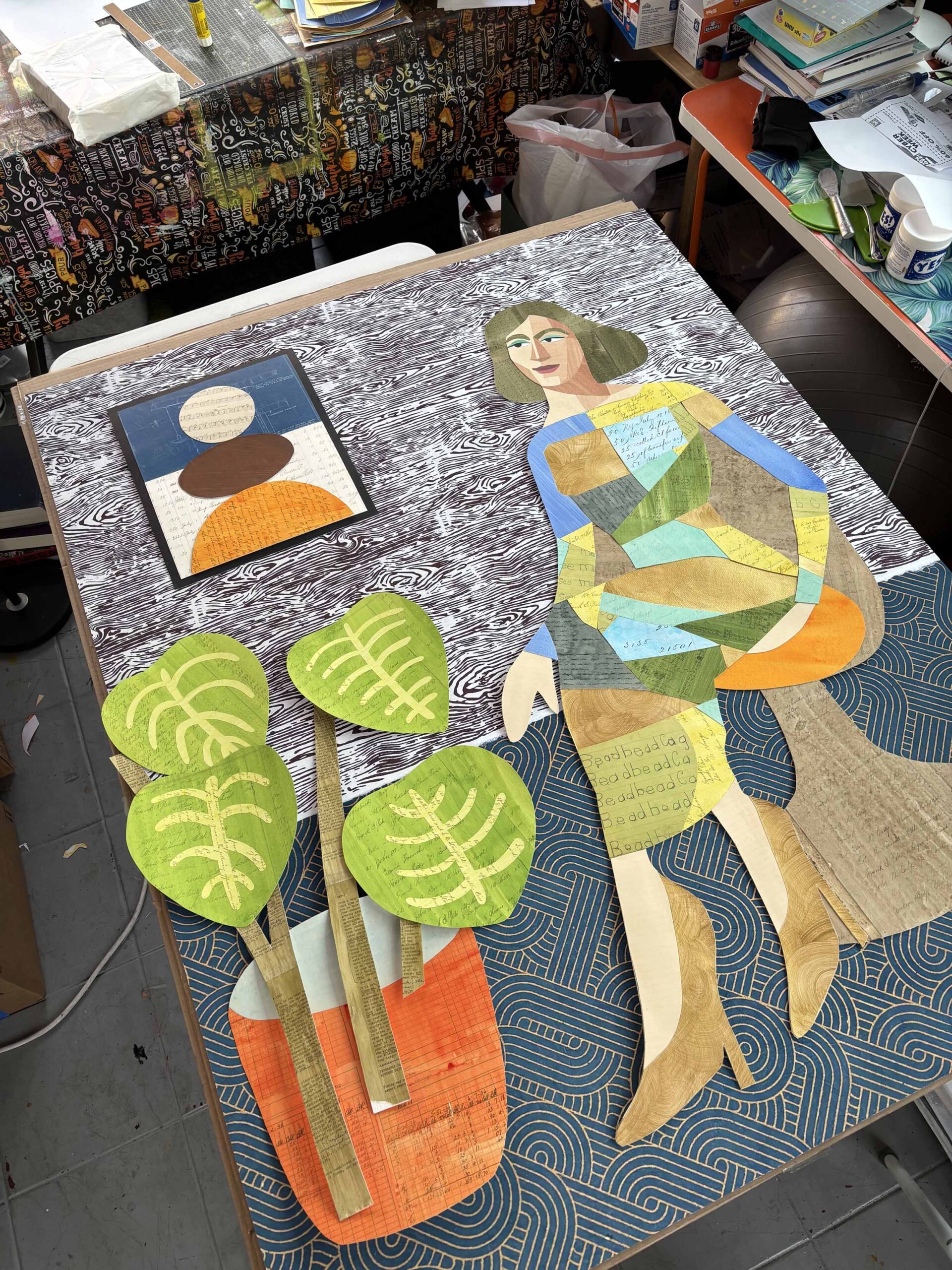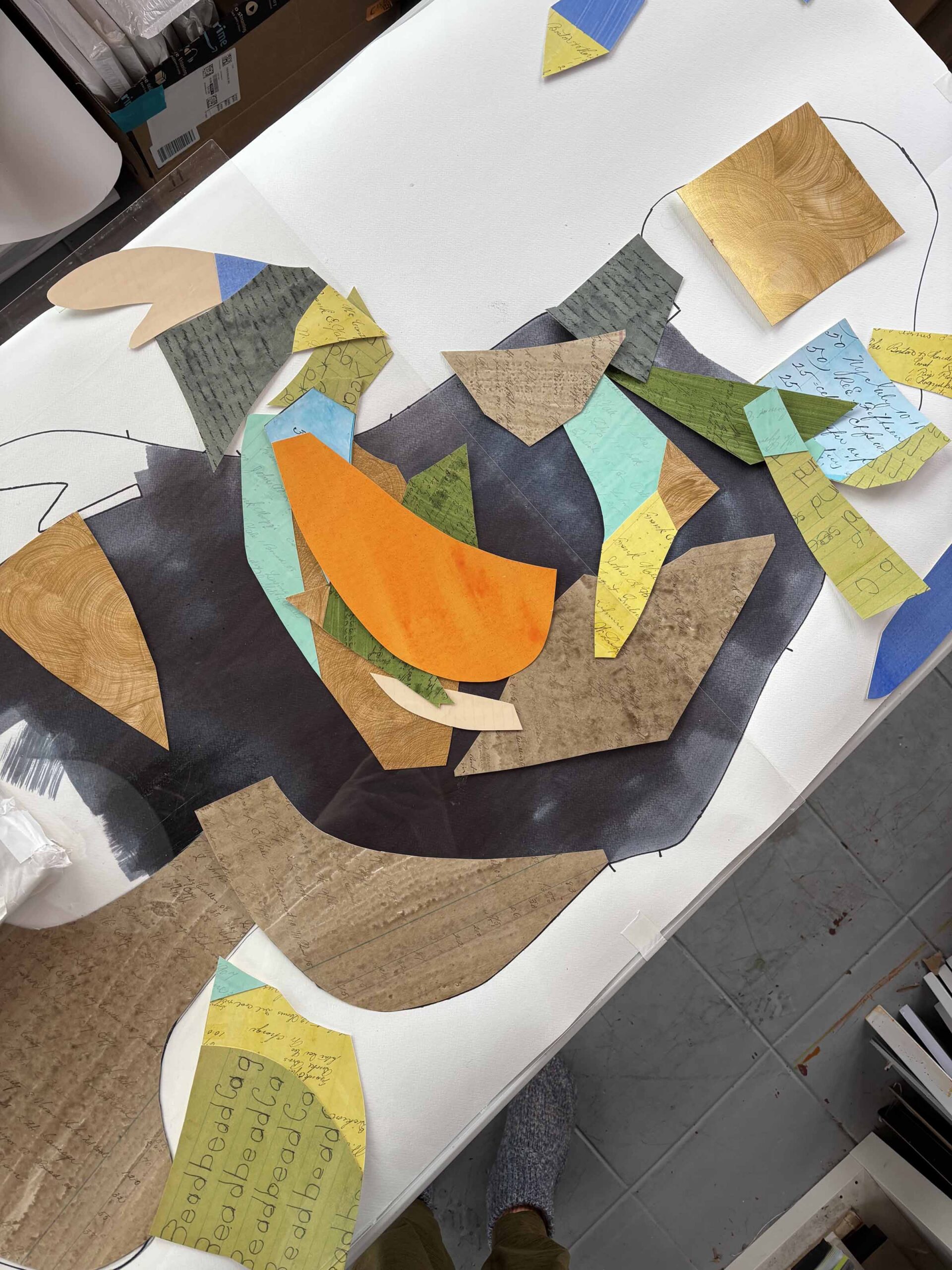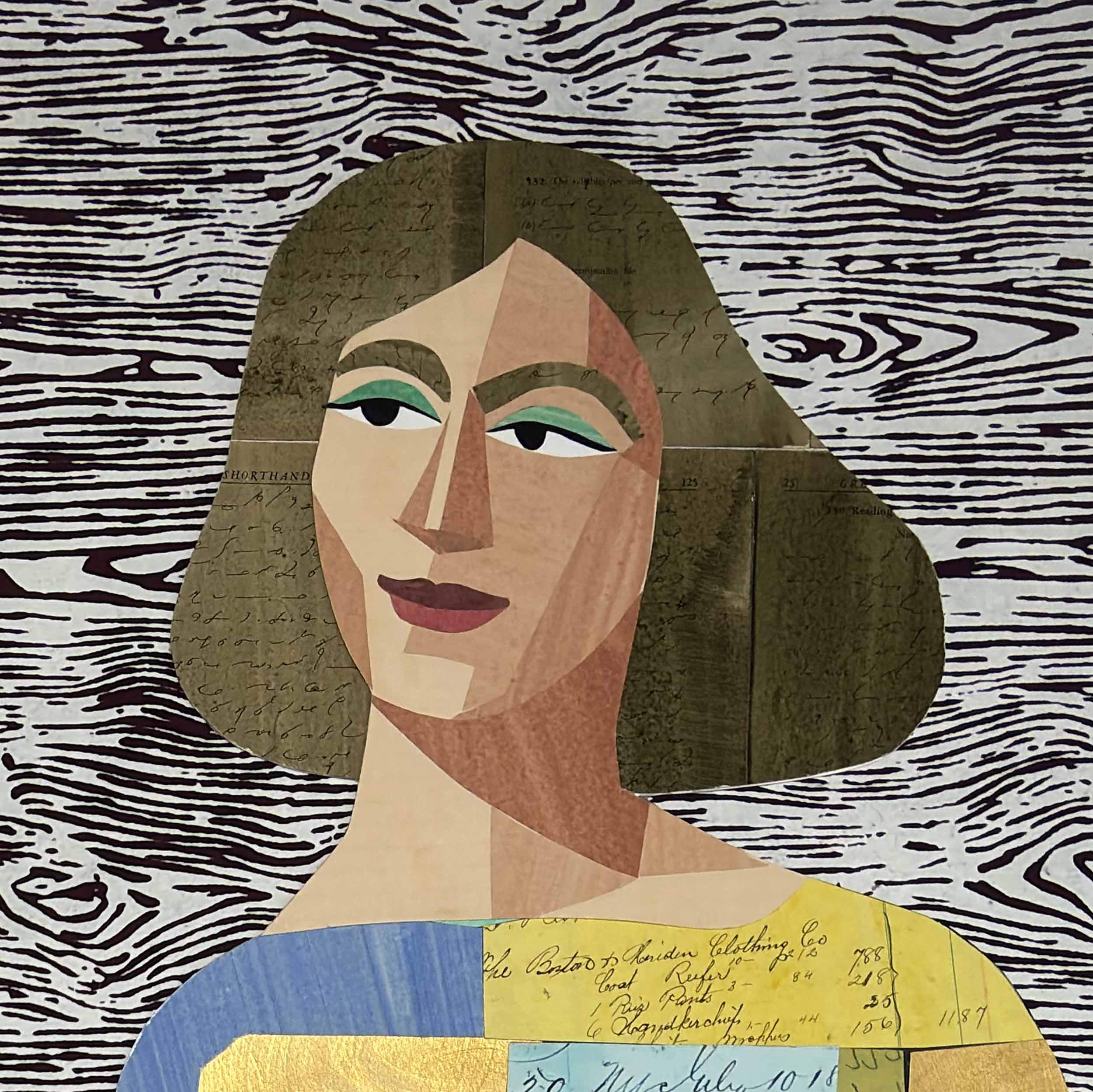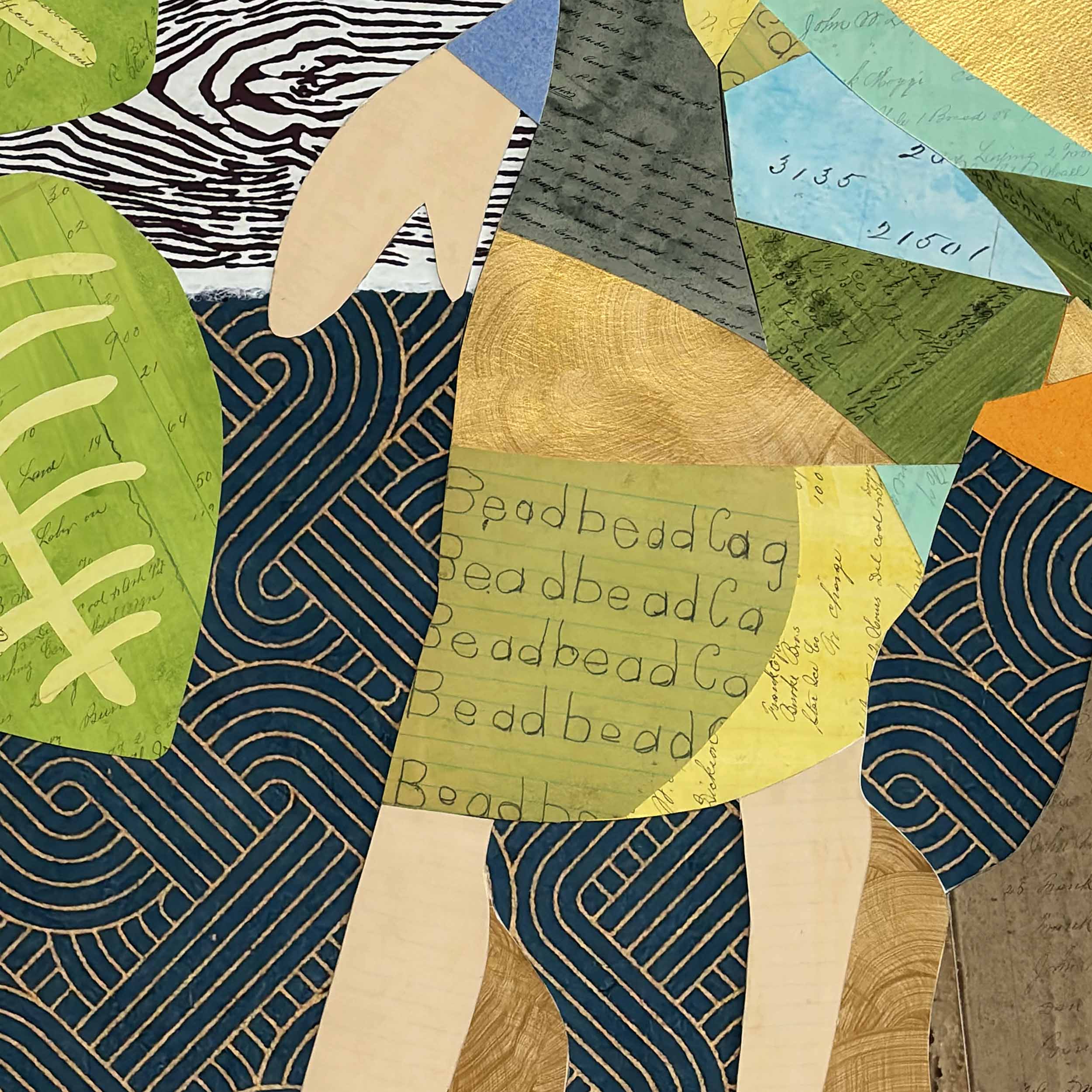The original is made from ink-washed 1800s ledgers, 1966 astrological charts, 1910 Freemason’s Lodge meeting minutes, 1950s handwriting homework, 1920s Sunday School attendance sheets, metallic gold paint, pages from a Shorthand manual, acrylic, blueprints, pattern-printed Nepalese Lokta paper, and handwritten musical notation